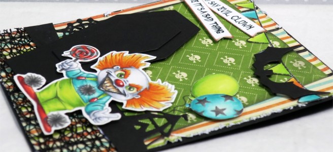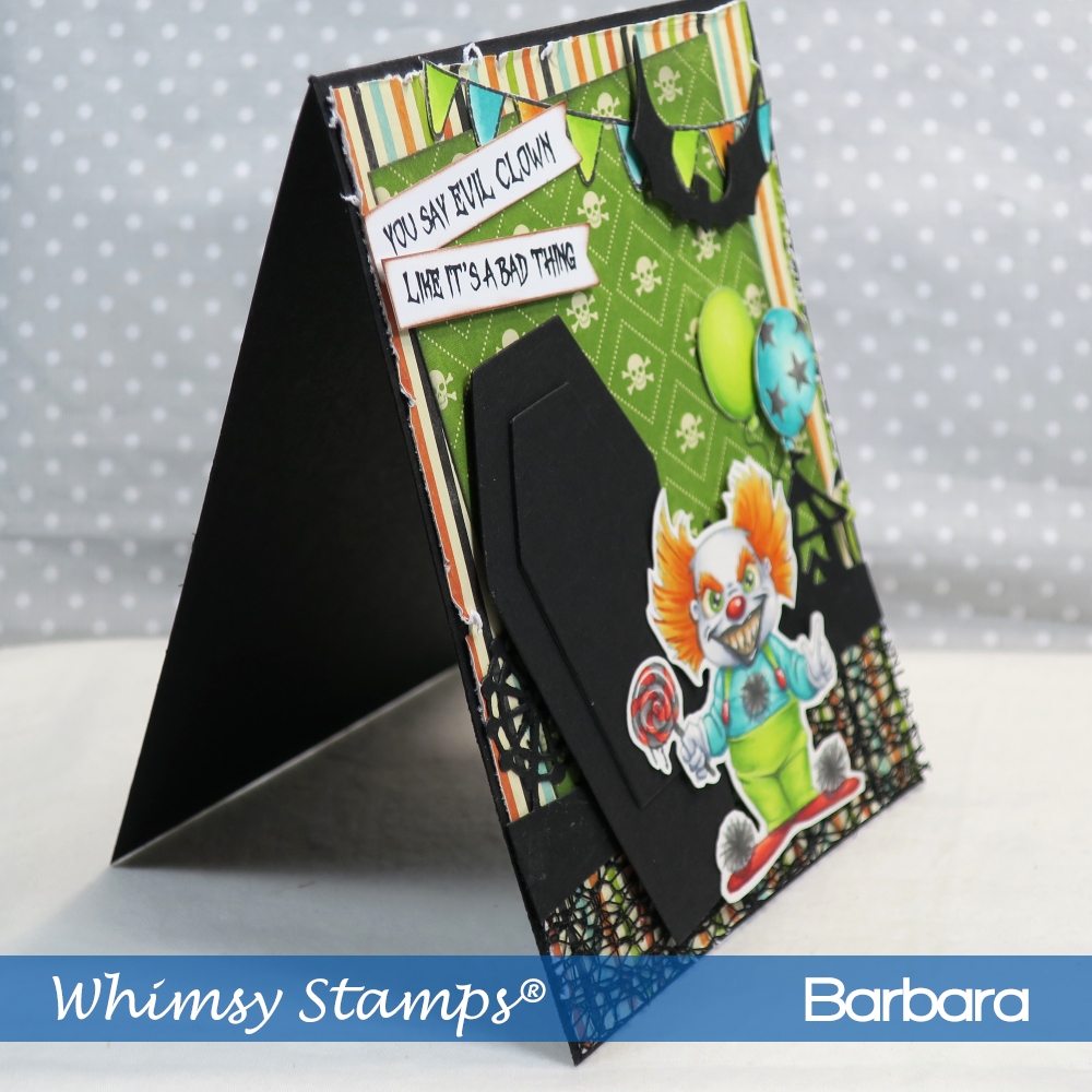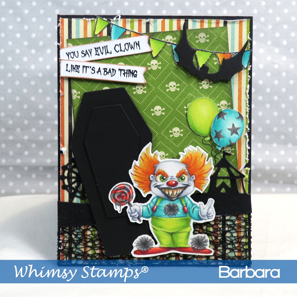 For my project I used the Creepy Clowns clear rubber stamp and also Dracula’s Coffin Die Set, both from Whimsy Stamps, to create this scene. The Creepy Clowns set has all sorts of accessories so I had to use a few of them – the balloons, star, banner and the saying.