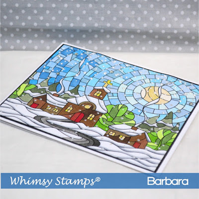 I’m working on a few mail-able Christmas cards which means I’m trying to keep them flat and not square. The new Stained Glass Village rubber stamp from Whimsy Stamps fit perfectly for this and I was excited to color the sky on this one. For embellishments, I added a few gems then dotted Liquid Pearls all around for falling snow.