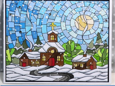 I’m working on a few mail-able Christmas cards which means I’m trying to keep them flat and not square. The new Stained Glass Village rubber stamp from Whimsy Stamps fit perfectly for this and I was excited to color the sky on this one. For embellishments, I added a few gems then dotted Liquid Pearls all around for falling snow.