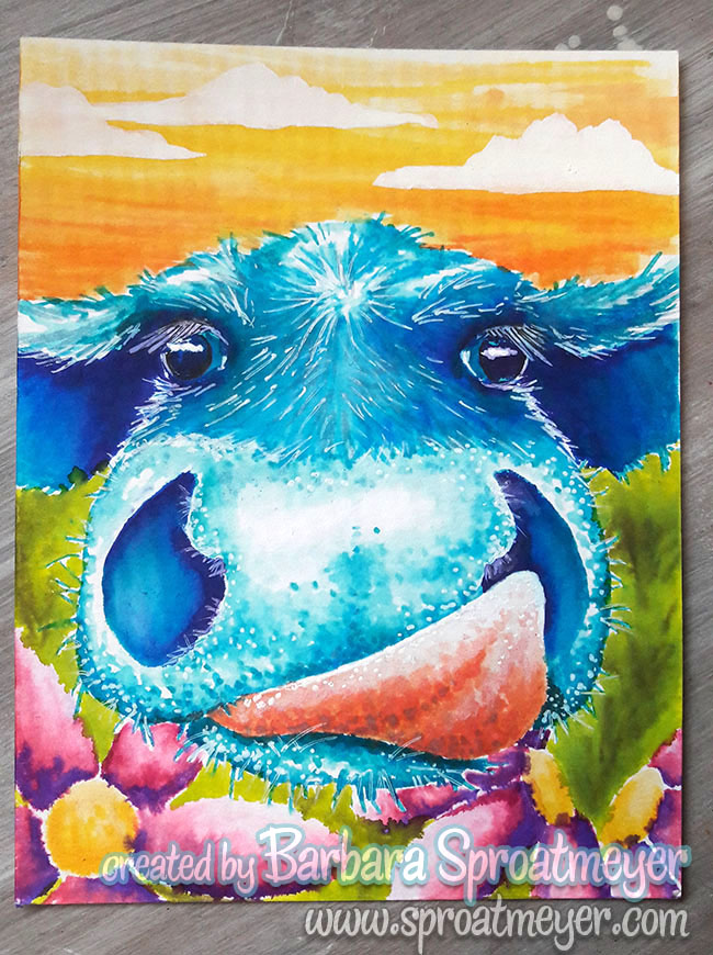 For this image, I sketched out my image lightly with pencil then continued to experiment using the Karin Brushmarker Pro watercolor markers. I mainly created a pool of ink then used a watercolor brush to the paper. The white highlights were a combination of a gel pen and white gesso.