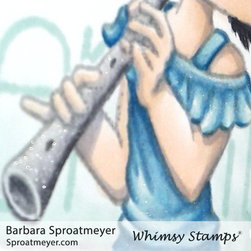 The last thing I colored was some glitter using a glitter brush I had to give the dress and pipes some sparkle. It doesn’t show up on the photos very well but in person it’s a nice detail.