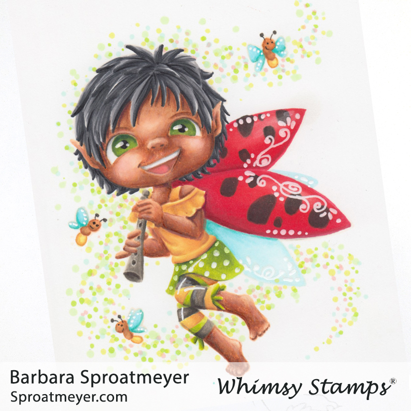 This is a new release at Whimsy Stamps for this month and she is named Polka Dot Pals Khadija. I added the face that was included and used the wings and fireflies together to create this little scene. In addition to using those elements from the set, I added pointy ears through creative color placement and made her more fairy like.