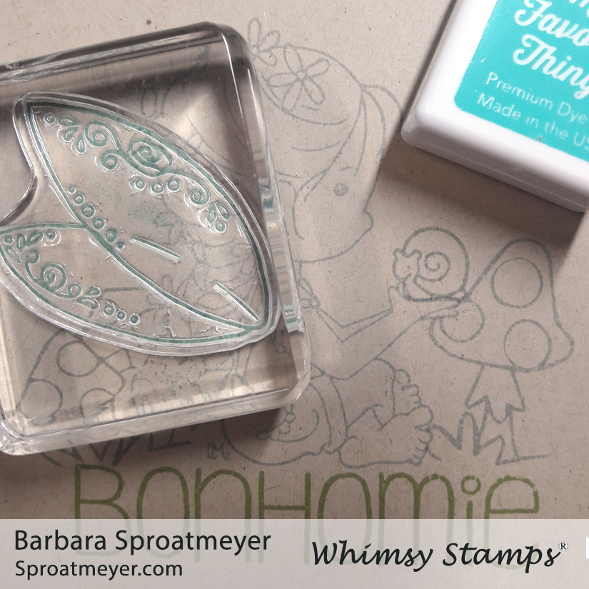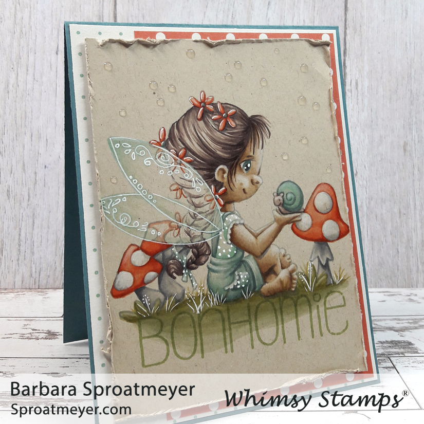 Most of the elements on this card are from the Polka Dot Pals Imogen set, including the sentiment. The wings were added from the Polka Dot Pals Kadija set. The sentiment was stamped in green so I could create a ground for her to sit on – I wanted it to be there but not to stand out more than the character. Bonhomie, by the way, means a cheerful friendliness. (Pronounced like bon-a-me.)