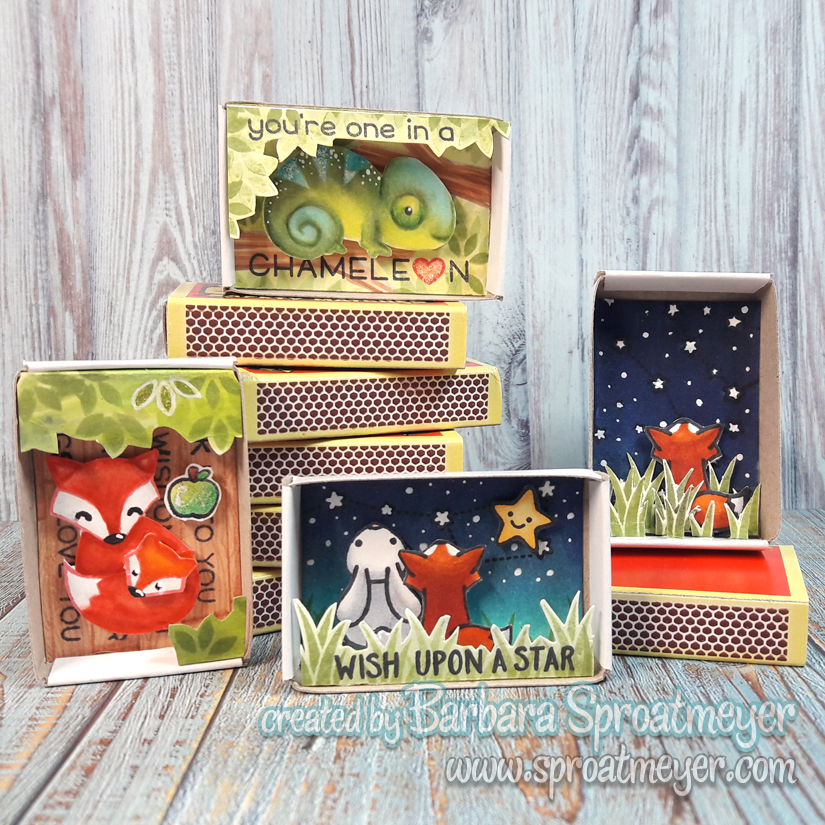 I made some more matchboxes and was able to herd my other two daughters in the room to make them too. These are fun little projects and not as intimidating as a full size image for them to tackle. We used several Lawn Fawn sets including Upon A Star, Mom + Me, and Chameleon to make these.