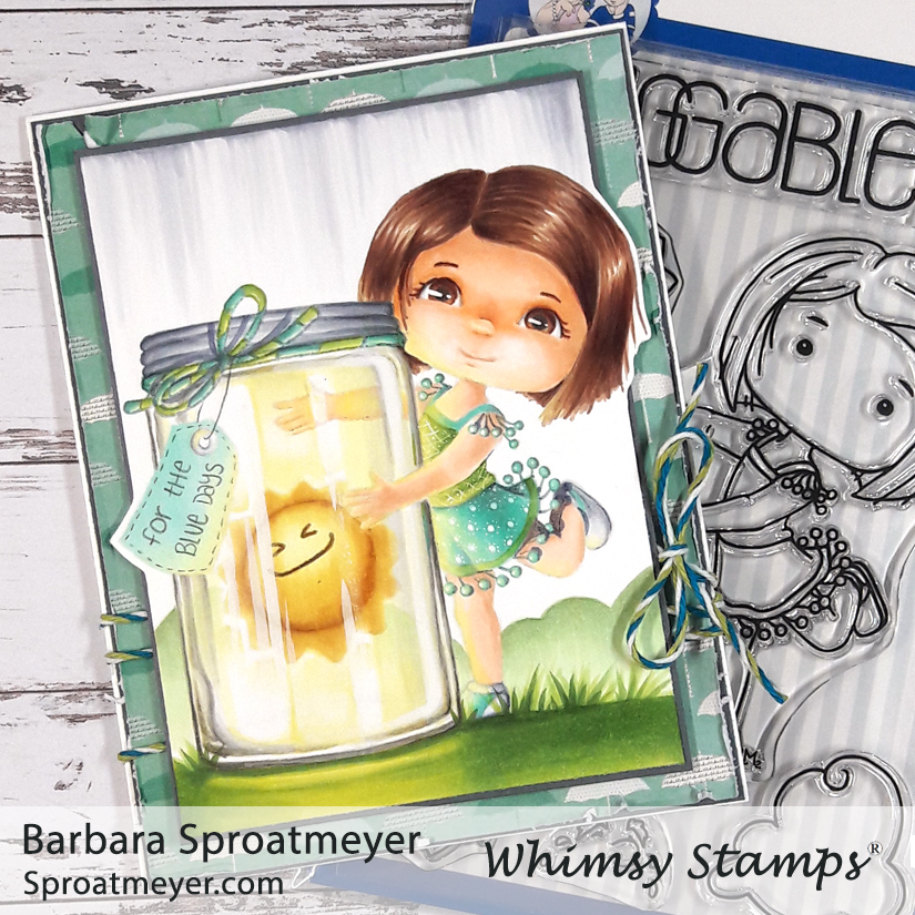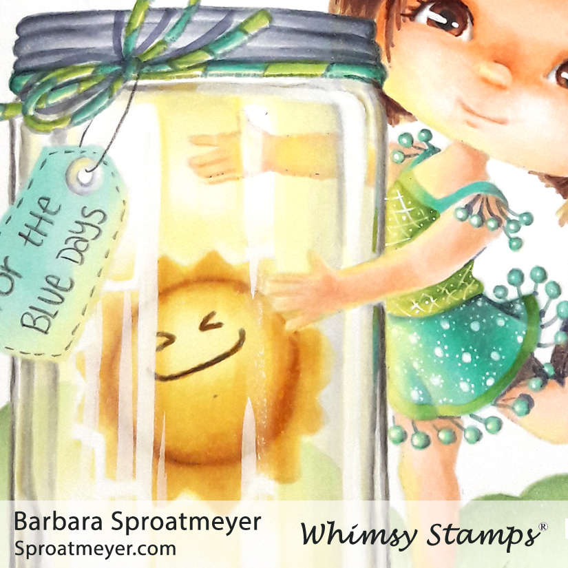 I’m excited to announce today is a new release at Whimsy Stamps and there are two new sets that I’m using today – Polka Dot Pals Atlas and the Atlas Jar. To create this scene, I used the sun and character from Polka Dot Pals Atlas set then the jar, tag and twine from the Atlas Jar set. This was a challenge for me to color sunshine in a jar but I think it worked out alright.