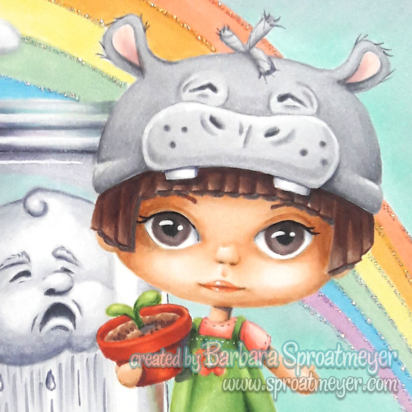 I sketched out the hippo beanie hat on scratch paper to figure out how I wanted it to look. Some stamp companies don’t like it when stampers add pencil marks or black fine-line marker to their images. But I already knew that Ann, and Denise for that matter, was completely ok with this so I lightly sketched the hippo hat onto my project. Otherwise, I would have to start coloring in the hippo without any pencil guides to satisfy the other company’s criteria. Which is what I did for the water puddle, grumpy cloud’s mouth and the rainbow since they didn’t have a lot of detail. I also gave this character a new hair dew (patterned after another Stamp Anniething character) and did this so the hat would “fit” better.