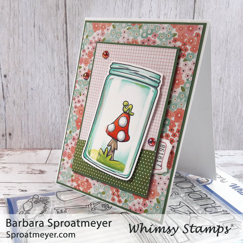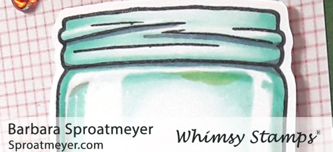 Here is the last jar for this week, using the Atlas Jar Coloring Tutorial posted earlier this week. On this project, I used the Atlas Jar clear set from Whimsy Stamps and used elements from the Polka Dot Pals Imogen set to fill it. What makes this jar unique is the color is different from the rest being a blue glass instead of gray. Also, added color to the sidewalls of the jar give this one a bit more character.