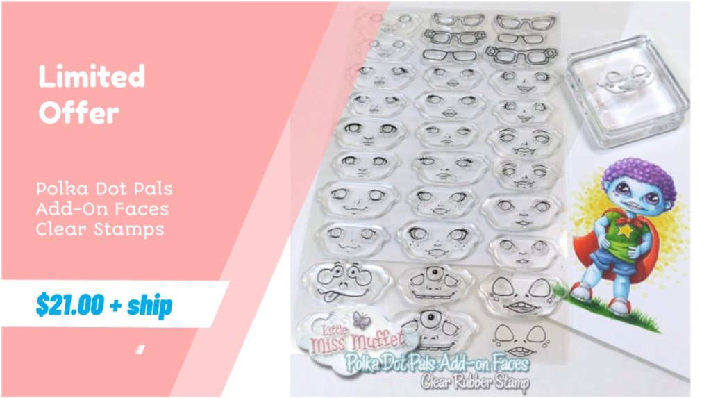 I have limited quantities of the retired set Polka Dot Pals Add-on Faces clear acrylic set that was released at Little Miss Muffet Stamps. All my extra inventory was stored away and I was able to find these. They are available on eBay until all quantities are sold. They will not be re-ordered or restocked. (I will delete this post once all inventory is sold out.)