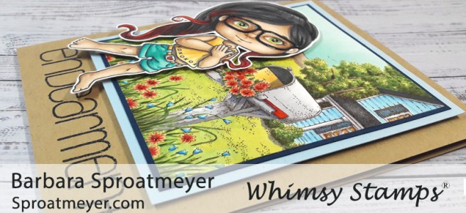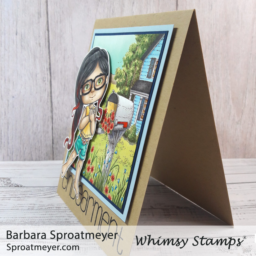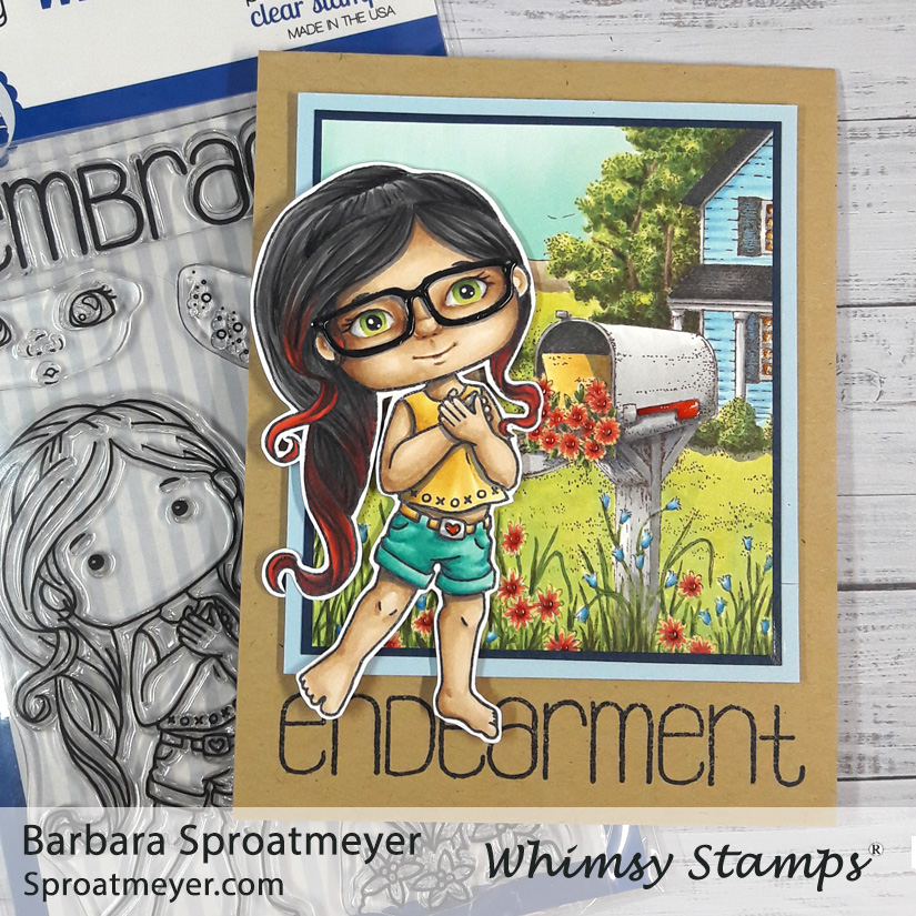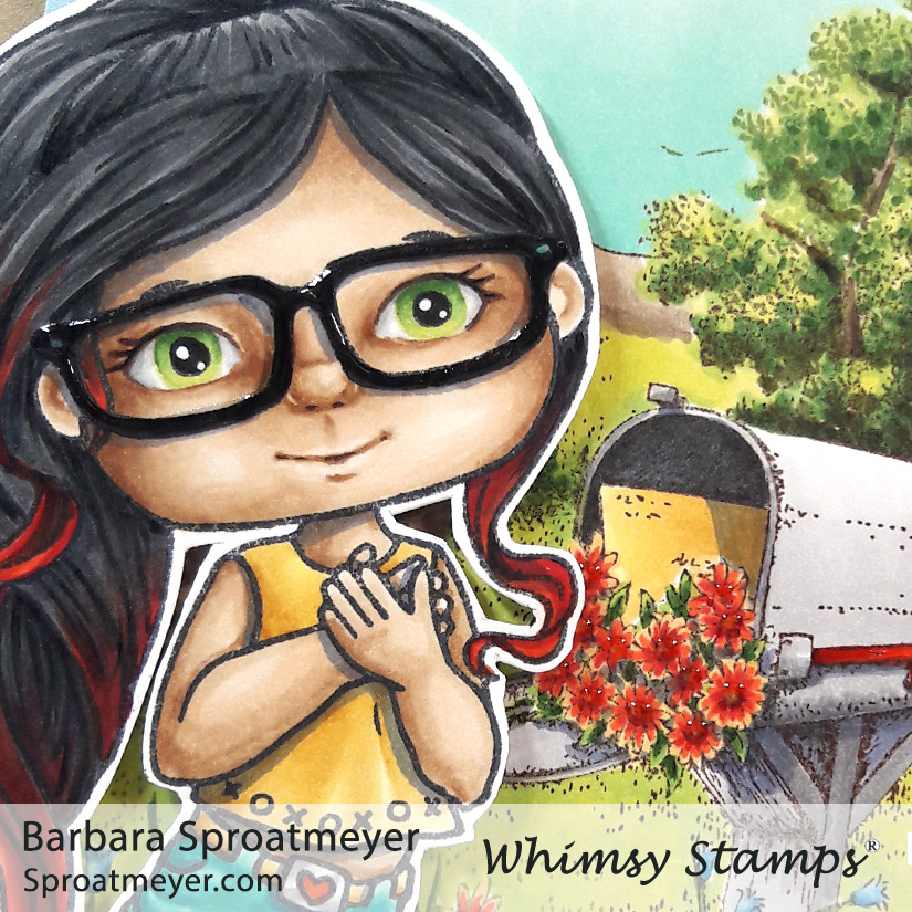 For this project, I’ve mashed up a Polka Dot Pal with a DoveArt stamp and created this scene. These combination is always fun to work on and they make great scenes. This one features The Mailbox in the background and Polka Dot Pals Mason as the character. I’d swoon too if someone put a friendly note in my mailbox with flowers. Sigh