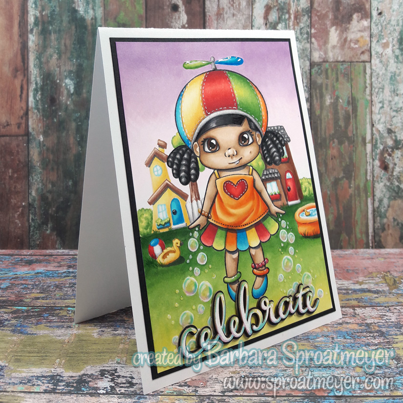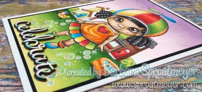 This little girl has bubble powers so she’s have a bright cheery day in the backyard. Wouldn’t that be fun to be able to produce bubbles from your hands? The sentiment is a light chipboard and easy to color with the Copic markers so I colored it similar to the bubbles and tied it in with the theme that way. To help it stand out, I did the second layer with black.