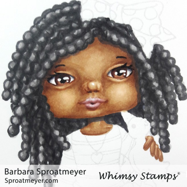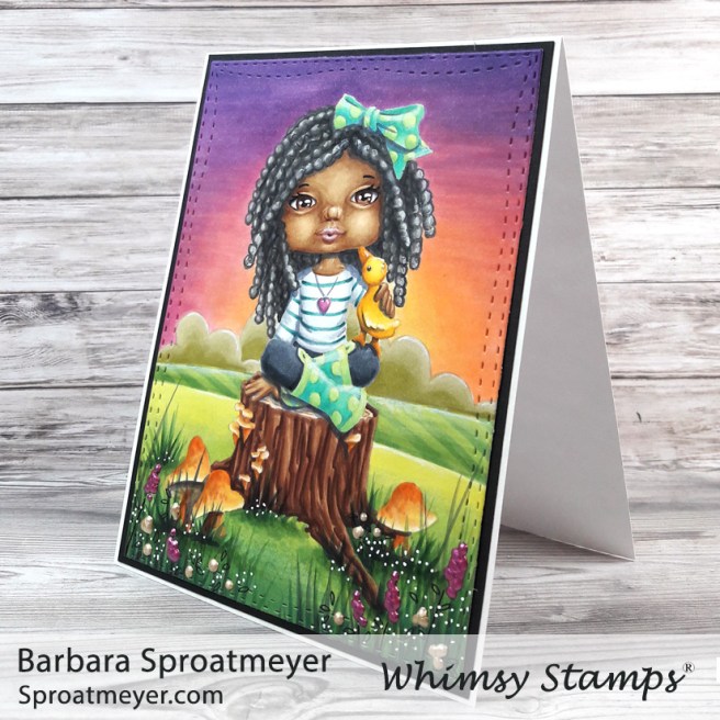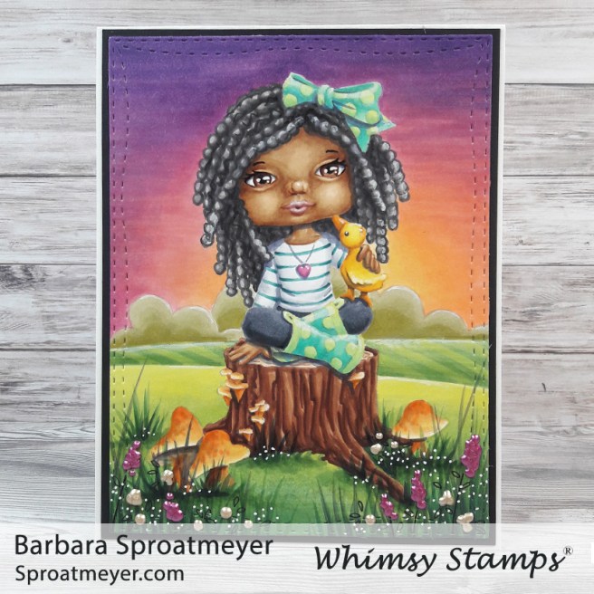 I had the chance to color up another digital coloring scene from Whimsy Stamps. This is Polka Dot Pals Fern Grassland Ponder. I started with creative color placement and changed the style of the hair. Then I colored the face and moved to the background. I wasn’t sure what color to do her clothes yet so I waited to see what was needed. This is how she turned out.