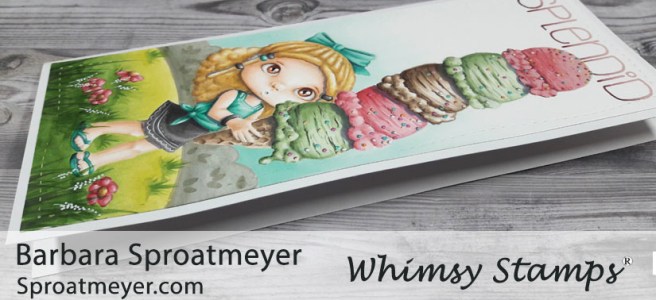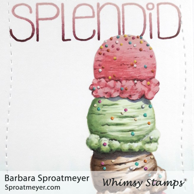 Since the card was longer than I normally work, I wanted to emphasize that with a tall scoop of ice cream. I have a tin with strawberry scented ice cream stickers and thought that would be perfect to use and they were about the same size. So the top scoop on this cone is the actual sticker. I fussy cut around the scoop then I drew and colored in the other scoops to match. The hardest part for me was trying to match the style of the sticker.