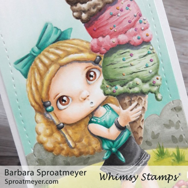 The image I used was Polka Dot Pals Kezia and I added the face from Polka Dot Pals Mason. The ice cream from the original stamp was not inked up which allowed me to draw in a tall stack of ice cream. More details on that below. I also used Polka Dot Pals Syeda for the flowers and bow in her hair and Polka Dot Pals Khadija for the sentiment.