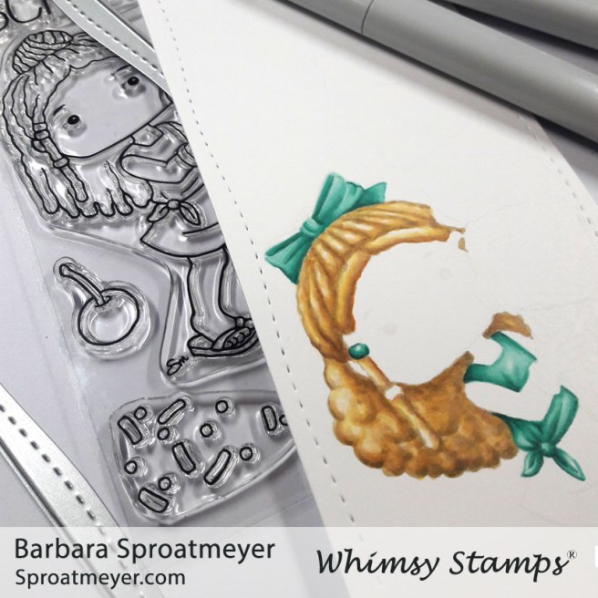 The ice cream was not the only thing I changed on this stamp. Here’s a work in progress photo which shows Polka Dot Pals Kezia up close. She is stamped in a light colored ink so I could use creative color placement to change her hairstyle. The top part I kept as cornrows but I replaced the bun with a bow and the lower locks with thick curly hair.