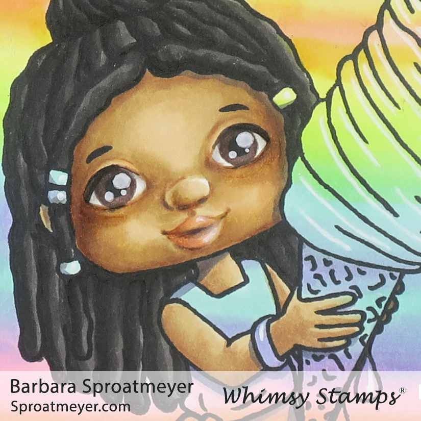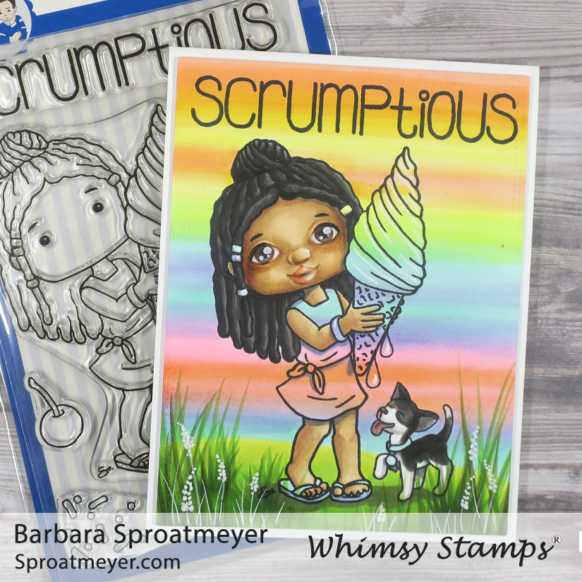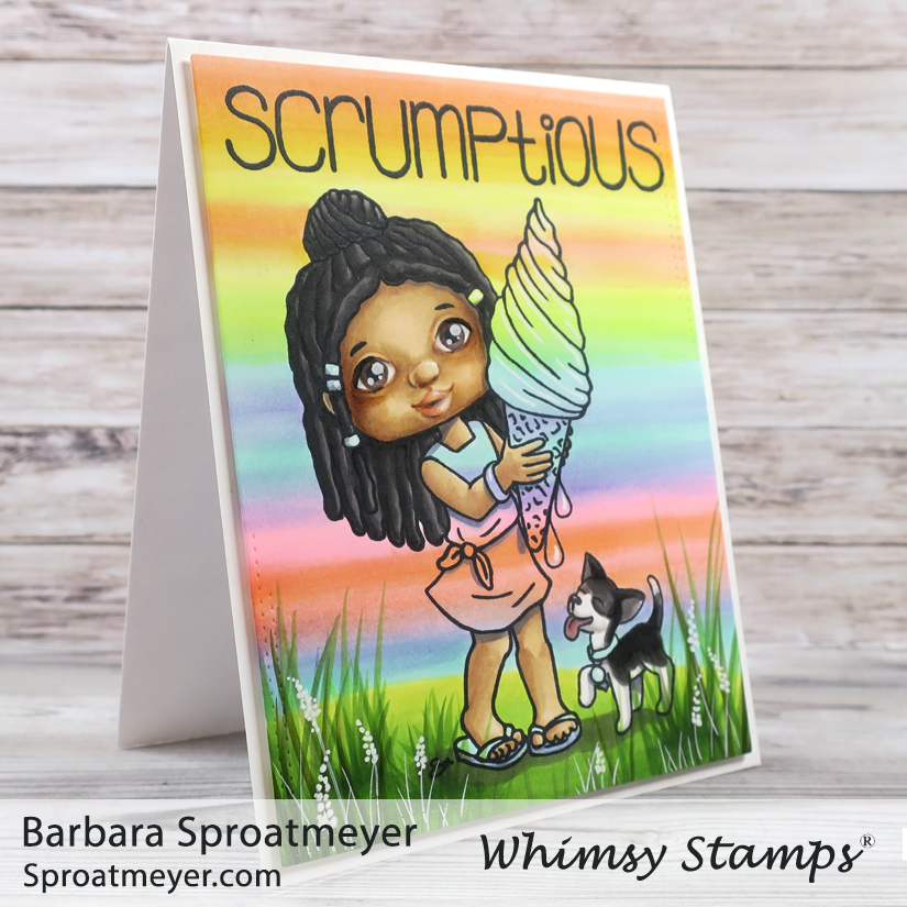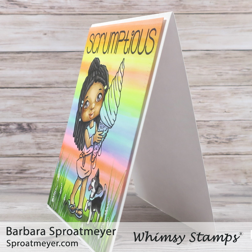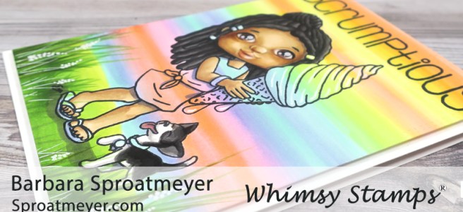 This card is one scrumptious sherbert-tastic card! I took an idea from my daughter who had colored an image as a rainbow through everything except for the head. I thought that was an intriguing idea and gave it a try with this gal, Polka Dot Pals Kezia and her little puppy.