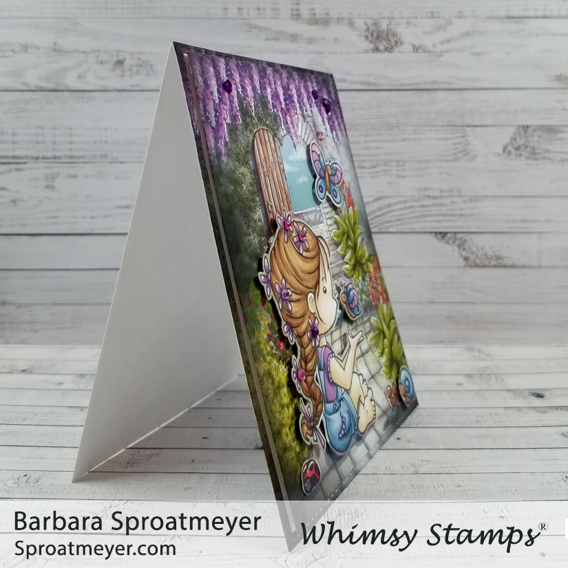 The background is the Garden Door stamp and you can see what it looked like before our friends arrive. Click on this link HERE to see that. I then proceeded to color the character stamps, Polka Dot Pals Imogen, and all her insect friends to fill out the scene. I colored Polka Dot Pals Imogen in purple and blues because I wanted to pull the colors from the wisteria flowers and the sky beyond to help round out the focal point. Plus it helps to make her stand out more among all the other colors.The extra stamps were cut out and instead of leaving a white border around the edges, I used the lighter colors from the background and colored that part. Before the white stood out too much and was distracting. Now it looks more like she is part of the scene and that they were meant to be together. Polka Dot Pals Imogen comes with the sentiment “BONHOMIE” which means “cheerful friendliness; geniality” and would be a great sentiment to add to the inside.