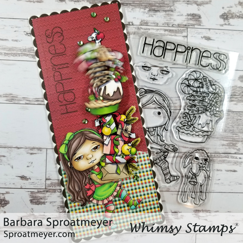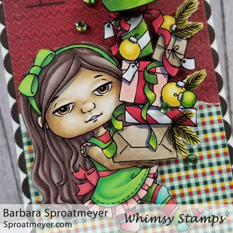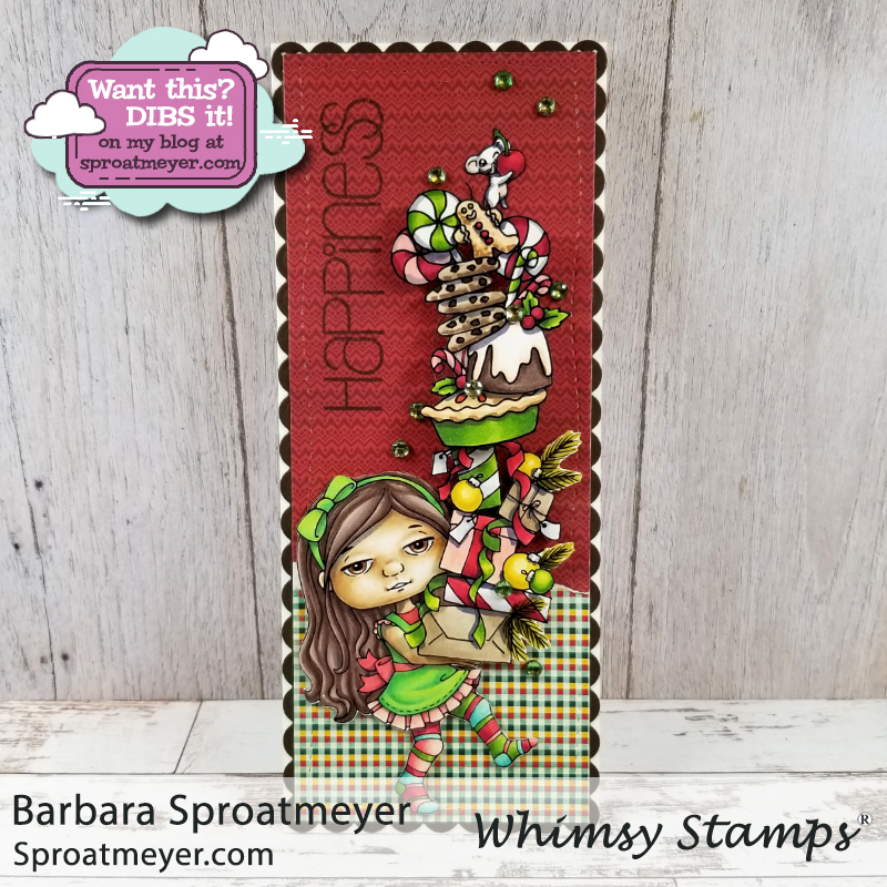 Winner announced below and another chance to dibs a card. This one is also using the new Polka Dot Pals Brianna from Whimsy Stamps along with a few slimline dies to create this fun holiday card. It also has a wobble component. Ooh aah! Read below for giveaway details and continue reading for more details on how this card was created using these featured products: