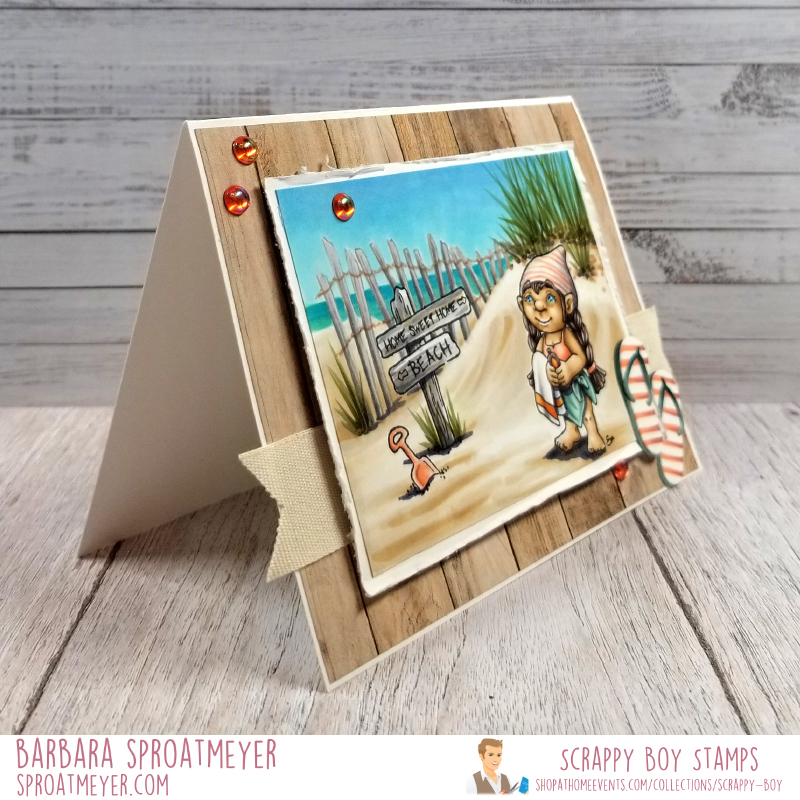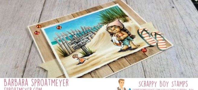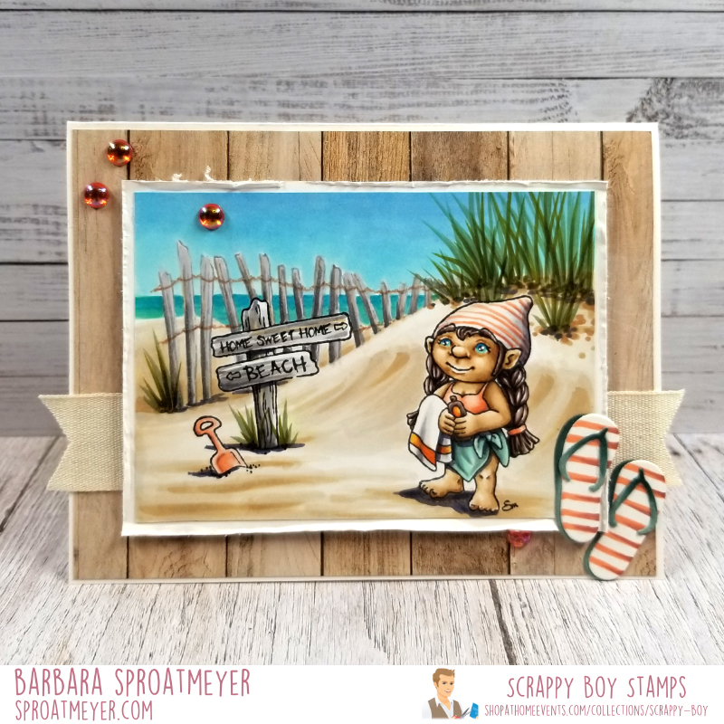 My gnomes are back at the beach today! This is a new release from Scrappy Boy Stamps and I used a few of the stamps included in the Summer With My Gnomies set to create this scene. This is probably my favorite of all four so I saved it for last. I think it’s the color scheme that appeals to me the most but it might also be that it was the most difficult for me to implement convincingly.