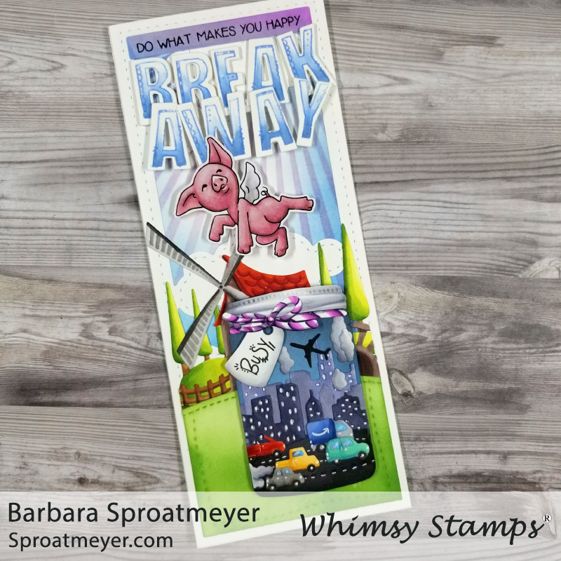 Take a break and do what makes you happy! We all need a break from our every day life and this card came about with that type of theme. I started with the Slimline Cityscape Die and tried to think of a fun way to use it – that’s when the Atlas Mason Jar Die came in mind to create a city scene inside. But one thing led to another and I ended up using seven different die sets, three stamps and one stencil to create this mega slimline scene. Read below for more details on how I create it featuring Pigs Can Fly Too as the star piglet in my story…