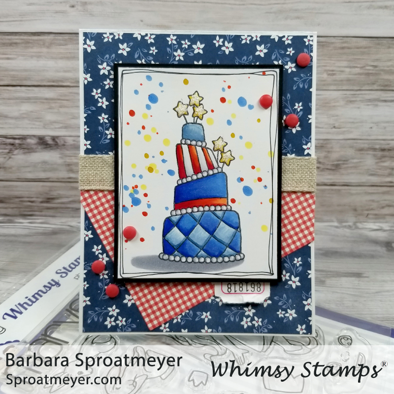 For this project, I used the cake, an accessory stamp from Polka Dot Pals Ophelia, and created a birthday card with a patriotic theme. I kept with red, white and blue to color and then added a little yellow in the stars and confetti background. I hoped that I could use it any time during the summer and not just for the 4th of July.