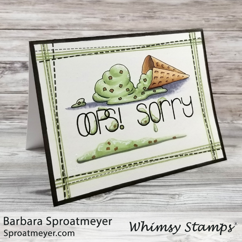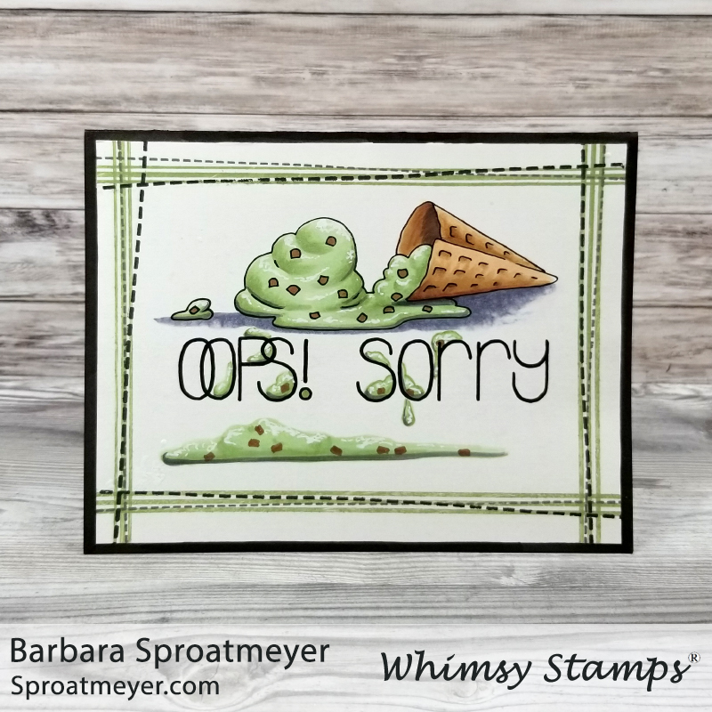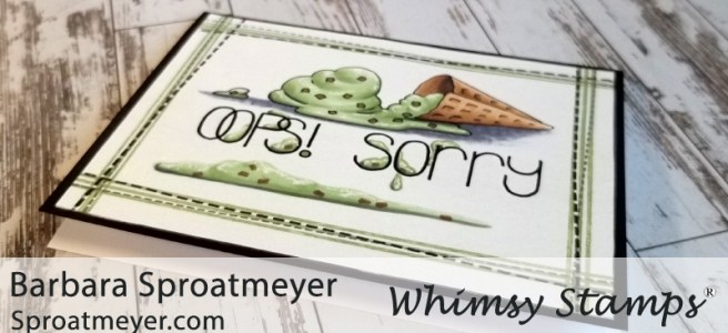 For this project today, I wanted to use one of the accessory stamps from the “Tin Games – Oops! Sorry” set from Whimsy Stamps. This one is the ice cream cone that has fallen over and started to melt. I thought it would be fun to continue the melting theme down through the sentiment and to the bottom of the card. Some days are just this type of day! I cam image this would be a perfect sorry card for a kid… or even a kid at heart.