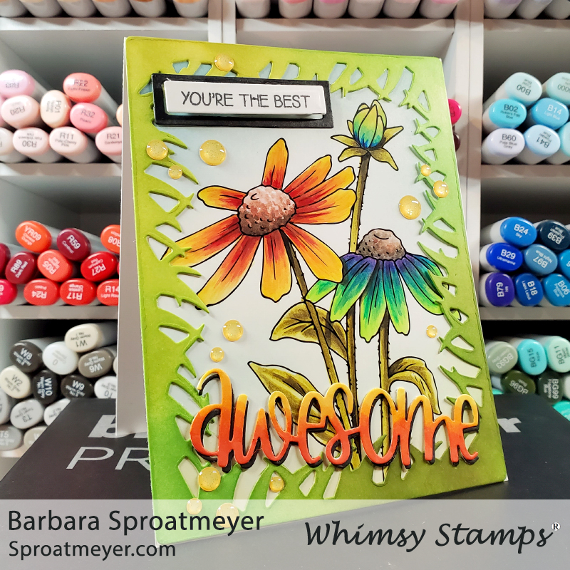 This colorful card features the cone flowers from Bees Knees and I chose to go with a rainbow theme for Cassandra. She had to leave Boot Camp early so I don’t remember if she saw it or not. I love these flowers done in any color but I think blues are my favorites. This was done with watercolors and this last week I created the card using a bunch of dies from Whimsy Stamps. Those were colored with Copics and Distressed Inks to come up with the final product. It was a lot of fun to create and I hope it brings a big smile to anyone who receives it.
