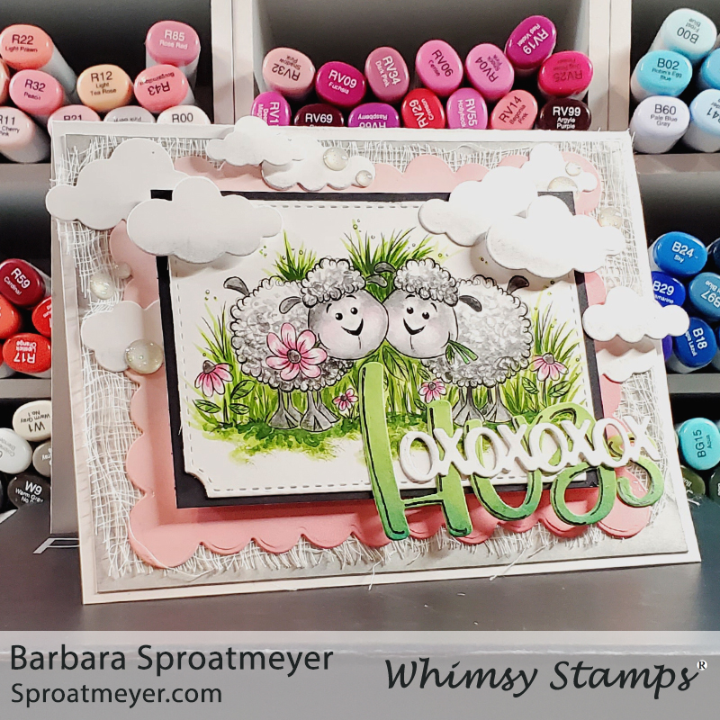 Even though this is a retired set, I’ve used several current products from Whimsy Stamps that I wanted to showcase and these can be used on any of your projects. I enjoyed using cheese cloth for a soft texture along with fluffy clouds – all things that reminded me of sheep. For the color pallet, I used three main colors of gray/black, pinks and greens so in essence I kept that part simple so all the elements could shine without standing out too much.