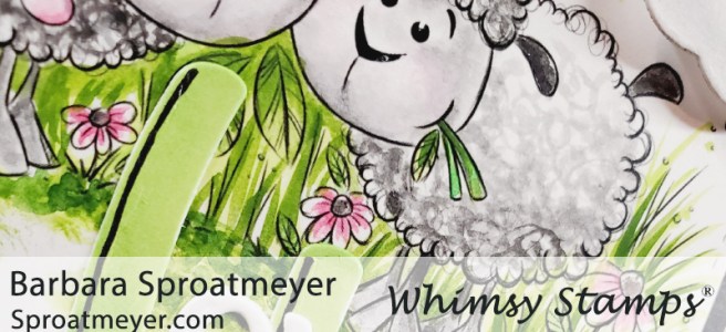Even though this is a retired set, I’ve used several current products from Whimsy Stamps that I wanted to showcase and these can be used on any of your projects. I enjoyed using cheese cloth for a soft texture along with fluffy clouds – all things that reminded me of sheep. For the color pallet, I used three main colors of gray/black, pinks and greens so in essence I kept that part simple so all the elements could shine without standing out too much.