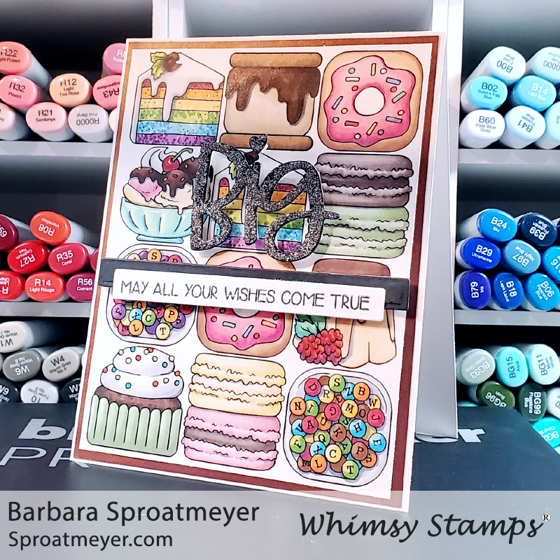 I colored this card a while ago and had planned to cut it all up and make more than one card. Then I thought, wouldn’t it be fun to make a card like this but apply everything loosely then take it apart and make more than one card after that? Yea that was my good plan but it didn’t follow through very well especially when I started using the glue instead of small squares of sticky tape. Oops. However, I like how this one turned out and shows all the desserts from Sweet Tiles – Desserts stamp set.