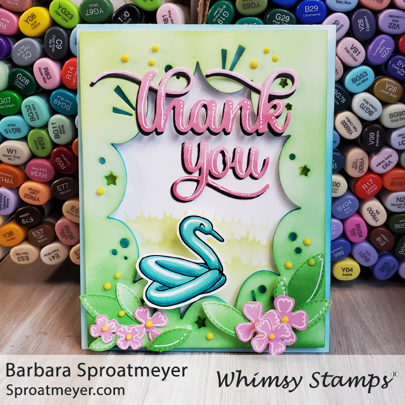The cards I make the most are for birthday so it helps me to make gratitude cards when there are new thank you dies to work with. This release you have multiple options to choose from too! This card uses the new Thank You So Much Word die plus a few other fun things to create a sweet thank you card. However, I think the swan from the Party Animal Balloons clear set is what adds “character” to the card. <pun totally intended. lol>