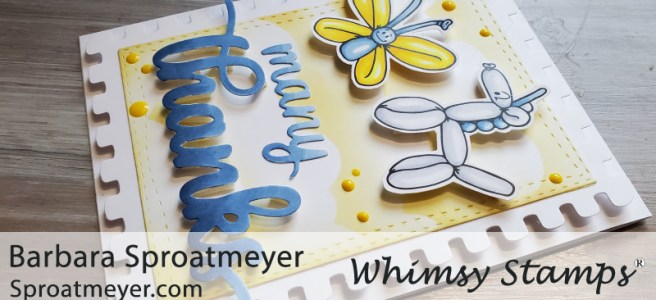 Have you noticed my card layout for the last three days? Each of them use the Extreme Postage die set along with the Wonky Stitched Rectangles die set to create the base. I love this combination and it reminds me of postage stamps, hand writing letters and post cards. It’s such a nice feeling to me. So for this card I chose to use the same combo and created this cute thank you card using the Party Animal Balloons clear set. I thought this would make an excellent card to send out for a gift thankfully received. This layout could also be done with a birthday sentiment instead of the thank you – just swap the words for something that works for you.