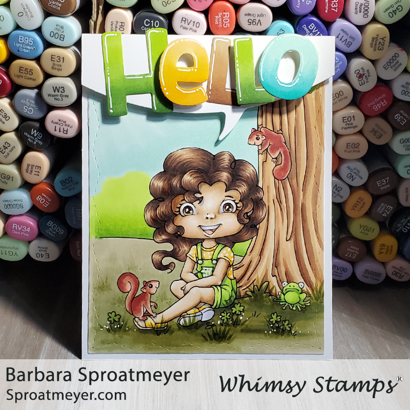 This card was initiated from a hair challenge. When I drew this image, I had Pinkie Pie in mind from My Little Pony Friendship is Magic. I love that show! Anyway, I drew the girl’s hair not considering how it could be colored and since Pinkie’s hair is a bit wild, I realized it would take a bit of a wild marker to color it. LOL This was my first attempt at coloring the hair. I wanted it to look like she had big curls so I followed the outside hair shape as well as the inside hair shape to create the bumps. The rest of the card was fun to color and create – and since the image was inspired by MLP Friendship is Magic – I decided to go with a friendly hello.