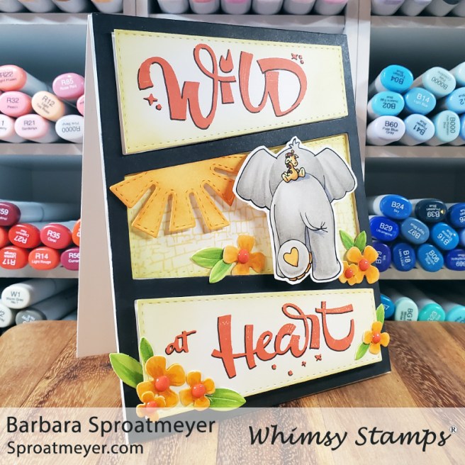 I have another cute elephant to share! For this card, I basically used the same supplies as the card yesterday with only a few changes but ended up with a completely different looking card. A lot of that has to do with the colors but also the layout contributes to that. At first I didn’t like the colors – what do you think? But then I added some heavy black and some black accents around the words which I think helped brighten it up. Isn’t that weird – to add black which brightens it? I thought so. This one is certainly out of my comfort zone but in the end I like how it turned out.