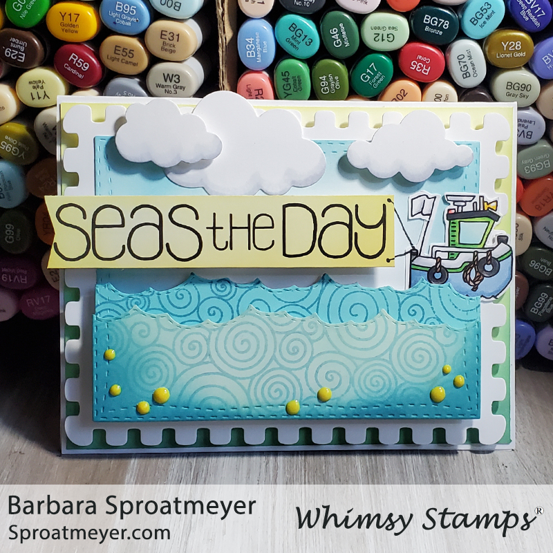 When I drew the Ocean Tiles Seas the Day clear set, I knew I wanted to play around with that little tug boat. After all, it’s the one that saves the day for all the other boats, right?! So I create this card using just that little tike and had it pulling the sentiment through the water. Seas the day, it says! I enjoyed using the Curly Q’s Background to create moving water and the Extreme Postage die to give this a traveling exotic feel. This is one of my favorite cards this week.