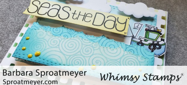 When I drew the Ocean Tiles Seas the Day clear set, I knew I wanted to play around with that little tug boat. After all, it’s the one that saves the day for all the other boats, right?! So I create this card using just that little tike and had it pulling the sentiment through the water. Seas the day, it says! I enjoyed using the Curly Q’s Background to create moving water and the Extreme Postage die to give this a traveling exotic feel. This is one of my favorite cards this week.