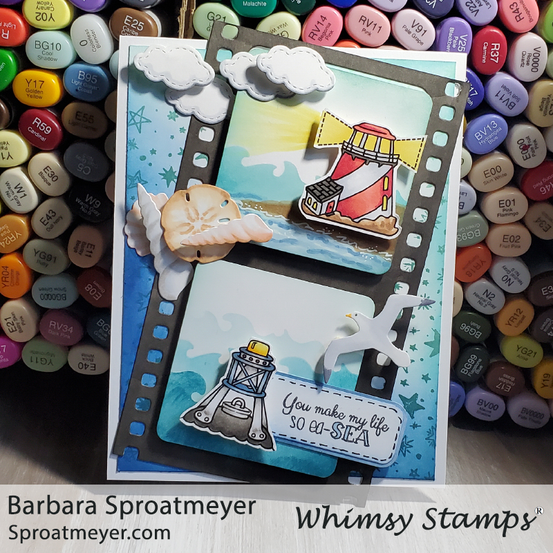 I had the the opportunity to drive around Lake Michigan this summer (in fact, I’m still on that same vacation but just a little closer to home). We mainly drove on the east side and tried to take as many lighthouse tours as we could and playing along the beach. Even though the water was C-O-L-D, the kids still enjoyed getting in and walking along the beach. So this card reminds me of all that and couldn’t be a better card to post at this time. I love all the elements and details – it makes it feel timeless like capturing one of our moments.
