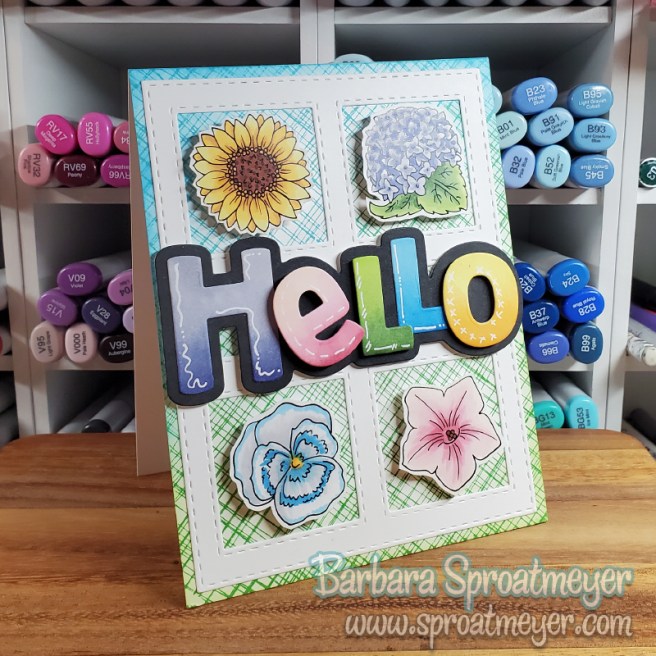 Flowers are good for everything, right? For this card, I had wanted to use the Peekaboo Window 2 die set with one of the tile stamp sets and decided to use the Flower Tiles. At first, I couldn’t decide if I wanted them all to be the same or not – but decided they were going to be all different. I think the sunflower is my favorite because it’s a bright yellow.