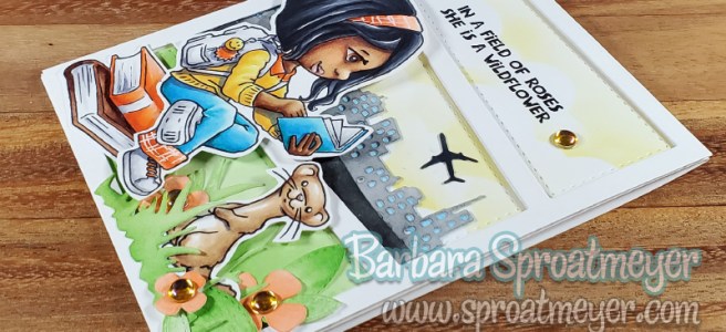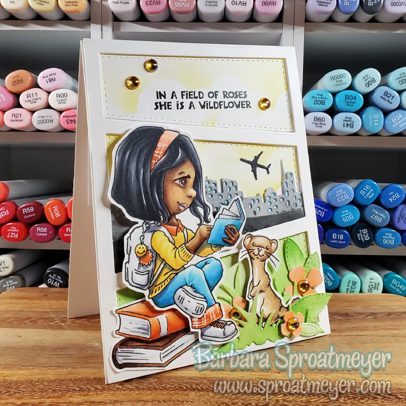 This is Polka Dot Pals Eileen and even though she lives in the city, she’s found a nice quiet park to read her book. This set and the other school-themed set, Polka Dot Pals Delia, are both on sale right now. These are some of my favorite sets and I enjoy using them for more than just school days. I used the same color scheme (mostly) as yesterdays card. I colored this gal live of Facebook so after adding these cuties to your shopping card, be sure to come on over and watch.