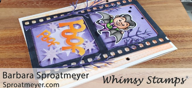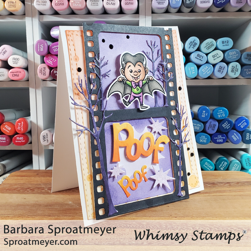 Whimsy Stamps is kicking off their Halloween mini releases in full tilt – there have been some in the past but this is one I decided to join in on. This set has kiddos dressed up for Halloween and I thought this little vampire was adorable. So I paired him with the new Poof! Word die and Film Strip to create this comic vibe card.