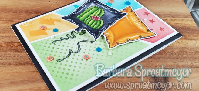 There are many ways to color shiny balloons and sometimes I wonder if it will turn out in the end. Most of the time it does. In this example, I enjoyed coloring the black one more than the orange. However, once I got it on a card with some other details then they booth look as cheery as ever. This is just one of the projects we did at the Sproatmeyer Coloring Toolbox Retreat.