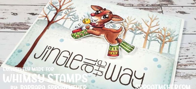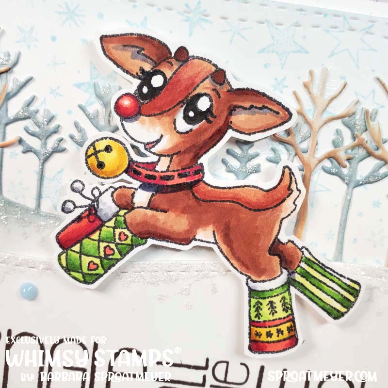 Let’s jingle all the way with this new reindeer set called Reindeer Games Jingle All the Way. That’s easy to remember. This little deer is having fun prancing in the forest with the freshly fallen snow – and keeping their feet warm at the same time with a mismatch of holiday socks. That’s how she’ rolls! It’s been fun to change gears and jump into winter cards.