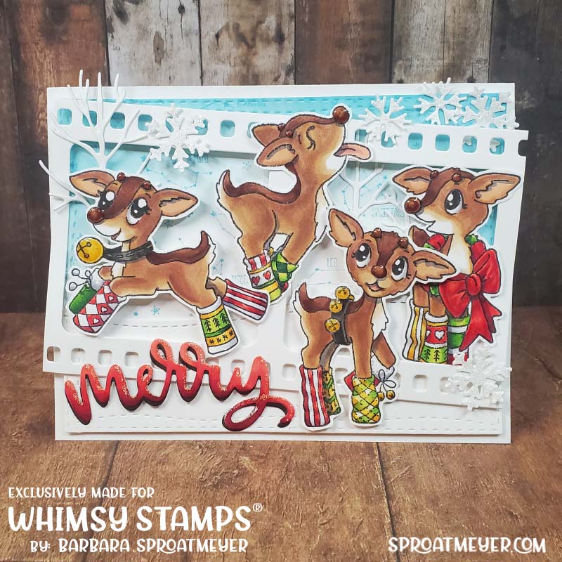 All the reindeer from the newest set (Reindeer Games Jingle All the Way) have come out to play! I wanted to get all four on the same card and thought of this design with the Slimline Film Strip die. I used a little color outside of the reindeer to help create the scene but hoped it didn’t take away the focal point of those four adorable reindeer. I don’t think it did and I loved how it turned out.