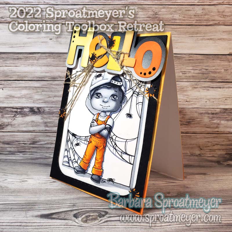 Are you tired of seeing Polka Dot Pals Colton yet? I hope not because today is one of my favorites and was the bonus project at the Coloring Toolbox Retreat. I would say this is the one that everyone learned the most about shadowing and coloring the eyes. I think adding all the cobwebs and the pop of orange draws in the viewer’s attention. Since this was a bonus, we colored the image together and everyone took that home to create a card on their own. This is what I came up with. Hello there!