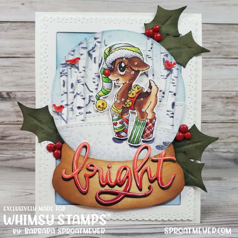 There is a new mini release at Whimsy Stamps today and, though I’m not featuring anything from this release, I thought I would feature some of the past releases that I missed… specifically with the Reindeer Games Jingle Shine Bright clear set and Holiday Snowglobe Outlines die set. This is one of four new reindeer to join the team of reindeer games and one of my favorites! This week, I’ll be showing cards I made with the others too – it’s certainly a set you’ll want in your collection especially if you have the other reindeer.