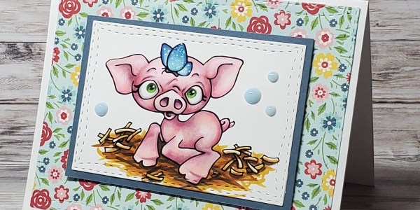 I actually had a bit of a hard time deciding how pink to make the pig, and in the end I kept the coloring soft. Instead of fully coloring in the eyes, I made them smaller so it looks like the pig is slightly cross-eyed, staring at the butterfly. For the card, I kept the design clean and simple and used metal dies from Whimsy Stamps so the artwork could really stand out.
