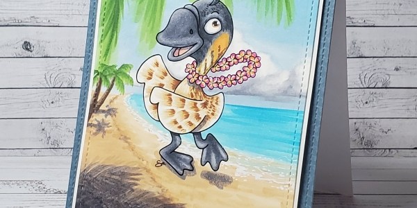 Here’s another new stamp in the shop called Duck Luau – I colored it after the Hawaiian goose, the nēnē. Technically this is a goose but can be colored up as any duck or bird. For the scene, I set her upon the beach with palm trees and gentle waves. I love the water, sky and shore side of the scene but not so much the trees and beach side. However, I learned a few things that I can do better next time so that’s how the process works. Happy luau!