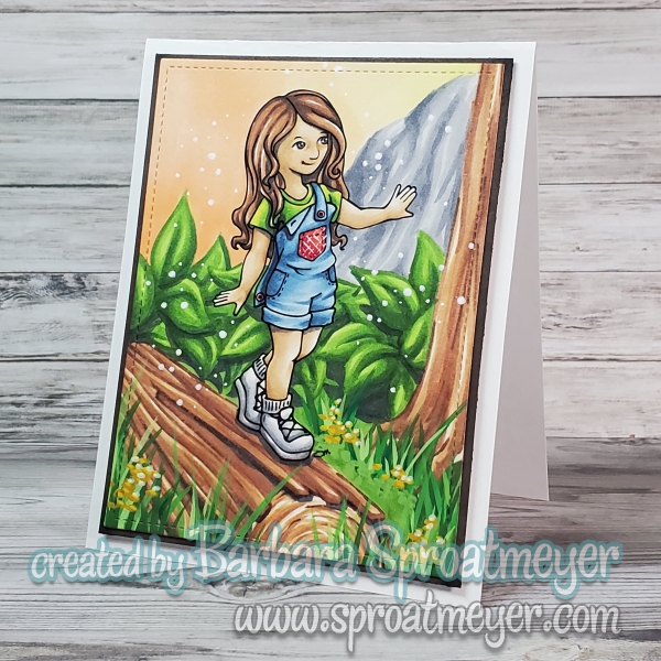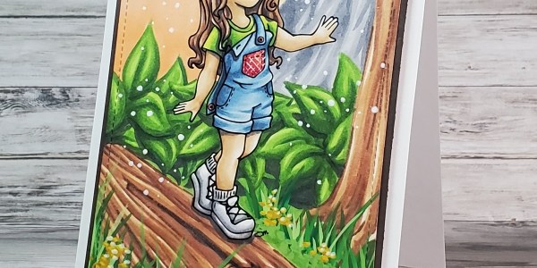 Three new stamps have been added to the shop this week and this is one of them. This is Girl Balancing and I thought she would be great in a scene out in the woods having an adventure. Of course, I can see her balancing on all sorts of things or just frolicking around with an active imagination. I colored this one mostly with Copic markers but then brought out the Artxx acrylic markers for the grasses and yellow flowers.