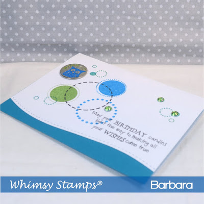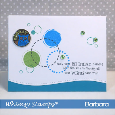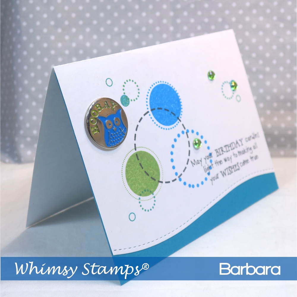 I’ve created a quick project using Circles, Circles, Circles and Magical Birthday Wishes Sentiment stamps from Whimsy Stamps. The colors I used were just Memento ink pads so there was no color necessary and that’s what made it a quick project. Lastly I added some embellishments and for a final touch I used one of the Pierced Border Trio Die, also from Whimsy Stamps, and added a little blue border.