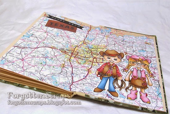 For my project today, I’m sharing a page in my traveling journal. I used an actual Texas map for the background then added my sentiment and two darling Wranglers to adorn the page. The images I used are Sugar ‘n Spice Dolls Dill as Jesse James and Sugar ‘n Spice Dolls Sage as Annie Oakley.