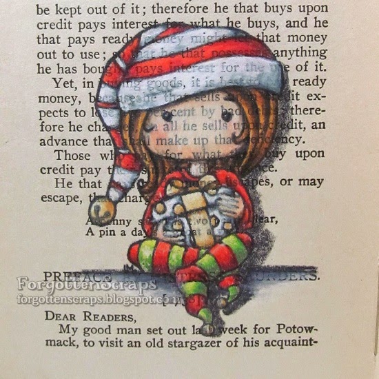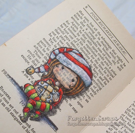 The image I used was Fancy Sunbonnet Winter Snowball from Little Miss Muffet Stamps which was stamped and colored in my travel journal. This time I colored the image with Marvy Le Plume markers. Most of the colors were easy to blend, surprisingly, but the red took some extra ink to blend from the darkest to the lightest. And as a result, the red bled through the paper and showed up on the other side. I’ve painted it with Gesso and will try to cover it up with another image so we’ll see how that works out.
